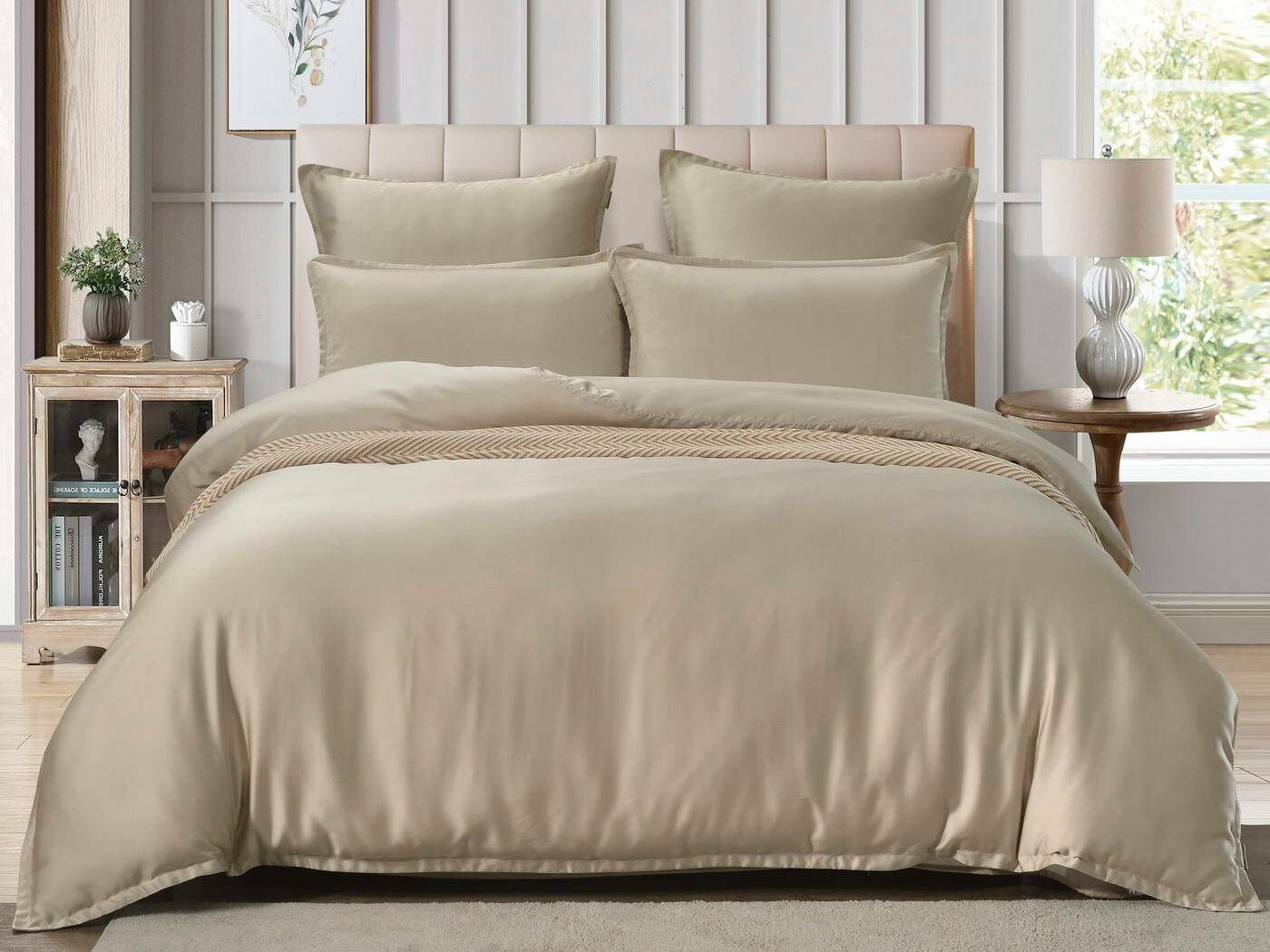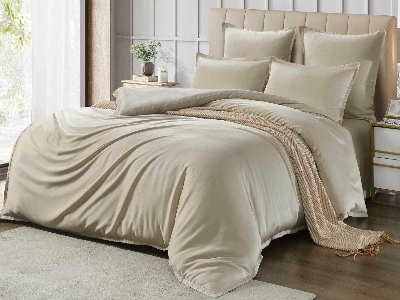 Комплекты постельного белья Ансель: нежность и комфорт каждую ночь Ищете постельное бельё, которое подарит вам незабываемый комфорт и уют? Тогда комплекты постельного белья Ансель из тенселя — идеальный выбор! Тенсель — это натуральная ткань, изготовленная из волокон эвкалипта. Она обладает рядом преимуществ перед хлопковыми тканями: более нежная, шелковистая и приятная на ощупь. Комплекты постельного белья Ансель включают в себя наволочки, простыню и пододеяльник. Они выполнены из 100% тенселя, что гарантирует высокое качество и долговечность. Одно из главных преимуществ тенселя — его способность пропускать воздух и хорошо впитывать и испарять влагу. Это обеспечивает оптимальный микроклимат во время сна, предотвращает появление неприятных запахов и бактерий. Ещё одно важное свойство тенселя — антибактериальный эффект. Это значит, что постельное бельё Ансель не вызывает аллергии и подходит для людей с чувствительной кожей. Уникальное свойство тенселя — климат-контроль. При высокой температуре в помещении ткань обладает лёгким и приятным охлаждающим эффектом, а при низкой создаёт ощущение тепла и комфорта. Комплекты постельного белья Ансель — это идеальный выбор для тех, кто ценит комфорт, качество и натуральность. Они станут отличным дополнением к вашему интерьеру и подарят вам незабываемые ощущения во время сна.