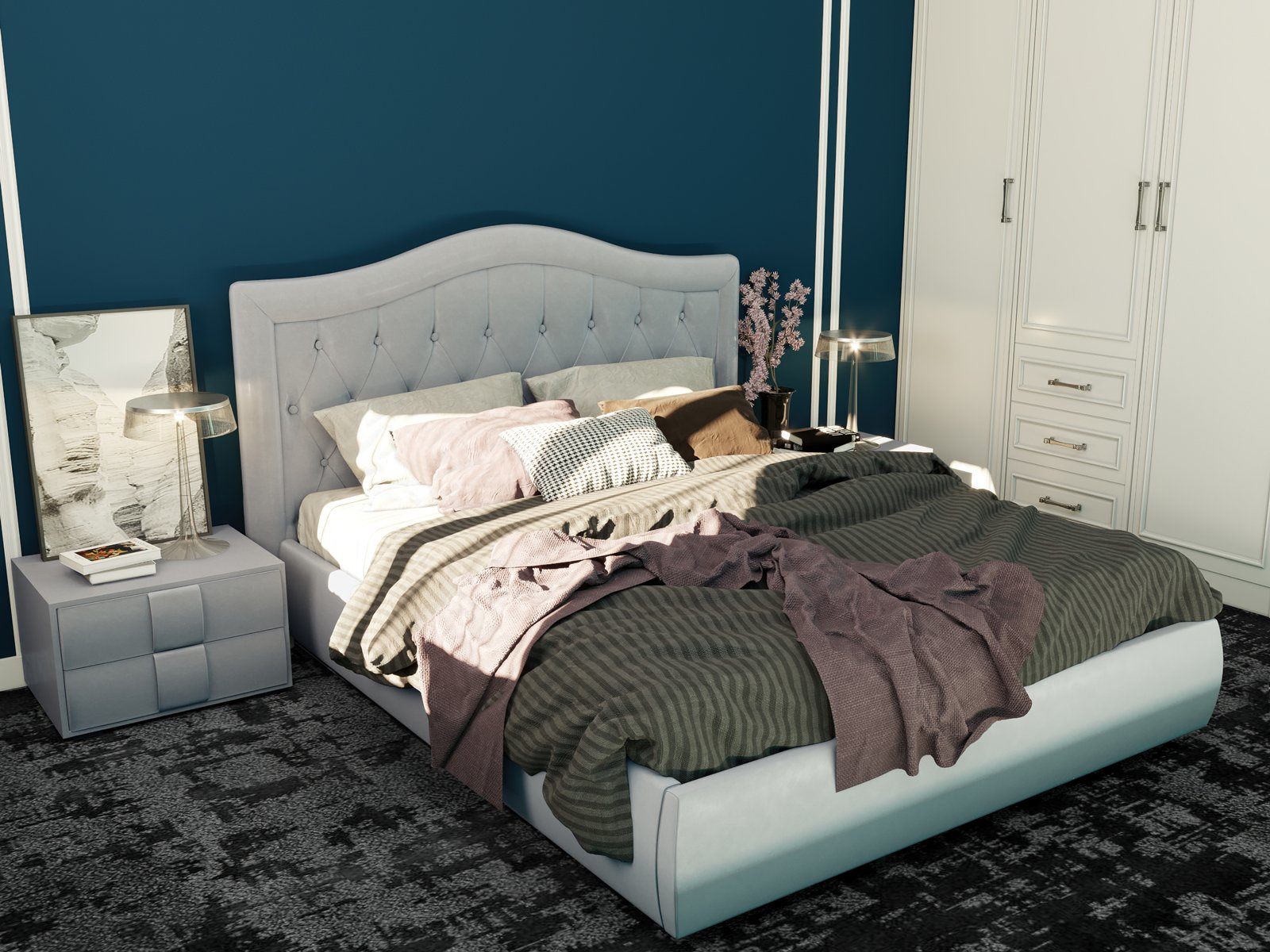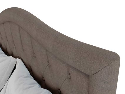 Кровать Эридан отличается высоким изголовьем плавной изогнутой формы. Спинка модели оформлена классической каретной стяжкой и дополнена пуговицами, обтянутыми в тон. Для любителей оригинальных решений производитель предусмотрел возможность замены пуговиц на сияющие стразы. Царги мебели получили плавные скользящие линии, которые делают силуэт обтекаемым. Продуманные формы наделяют кровать высокой функциональностью и позволяют безупречно вписать в любой интерьер.