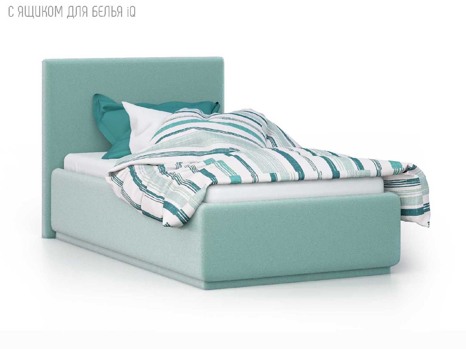 Кровать укомплектована IQ с подъемным механизмом и ящиком для белья без дна (дополнительная платная опция - дно к ящику IQ из HDF (ХДФ). Каркас кровати на цоколе, декоративный чехол на цоколе съёмный. Глубина ящика для белья - 30 см, без ограничения нагрузки на ящик.