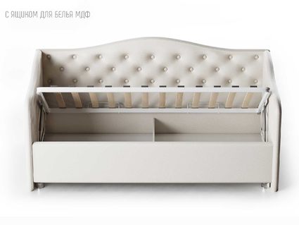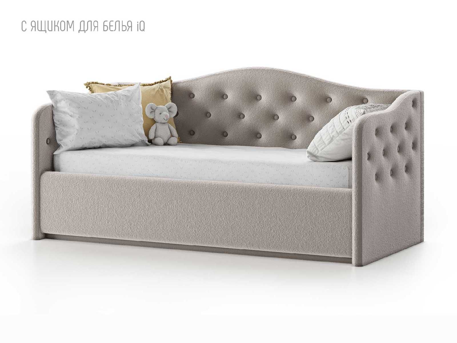 Кровать укомплектована IQ с подъемным механизмом и ящиком для белья без дна (дополнительная платная опция - дно к ящику IQ из HDF (ХДФ). Каркас кровати на цоколе, декоративный чехол на цоколе съёмный. Глубина ящика для белья - 30 см, без ограничения нагрузки на ящик.