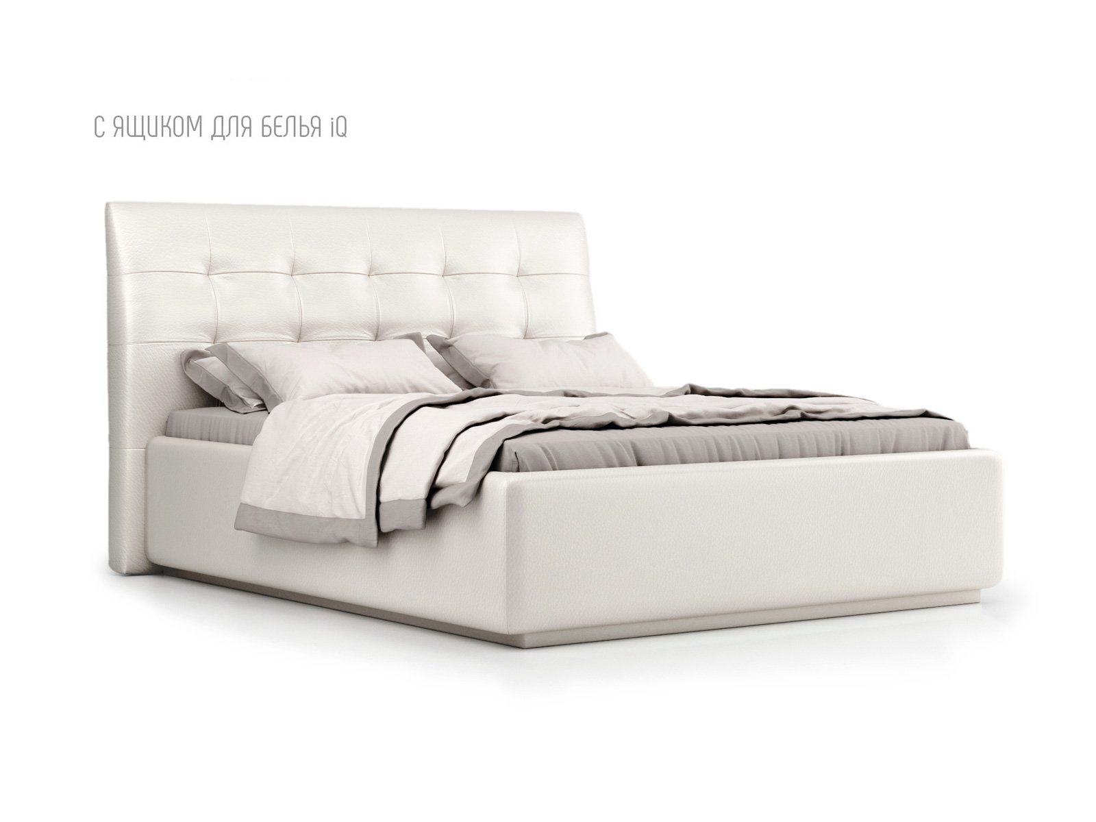 Кровать укомплектована IQ с подъемным механизмом и ящиком для белья без дна (дополнительная платная опция - дно к ящику IQ из HDF (ХДФ). Каркас кровати на цоколе, декоративный чехол на цоколе съёмный. Глубина ящика для белья - 30 см, без ограничения нагрузки на ящик.