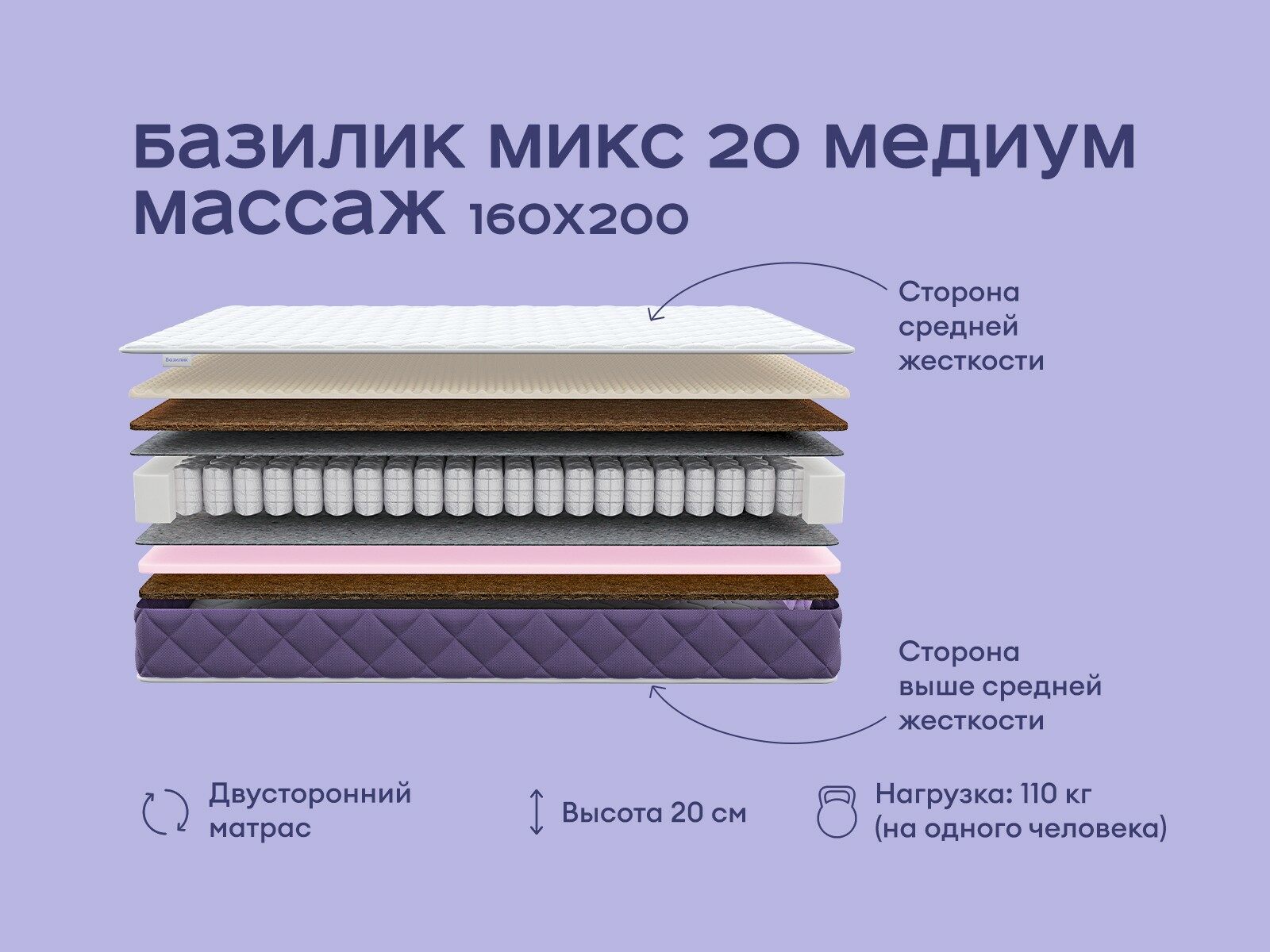 Матрас с ортопедическим эффектом Микс 20 медиум массаж гармонично объединил французскую эстетику и здоровой сон. Уникальный дизайн, вдохновленный лавандовыми полями Прованса, и сбалансированное массажное наполнение создают матрас высокого комфорта. Сразу две спальные поверхности и два уровня жёсткости позволяют настроить спальное место под свои пожелания, а усиленный блок пружин обеспечивает точечную поддержку спины и тела.