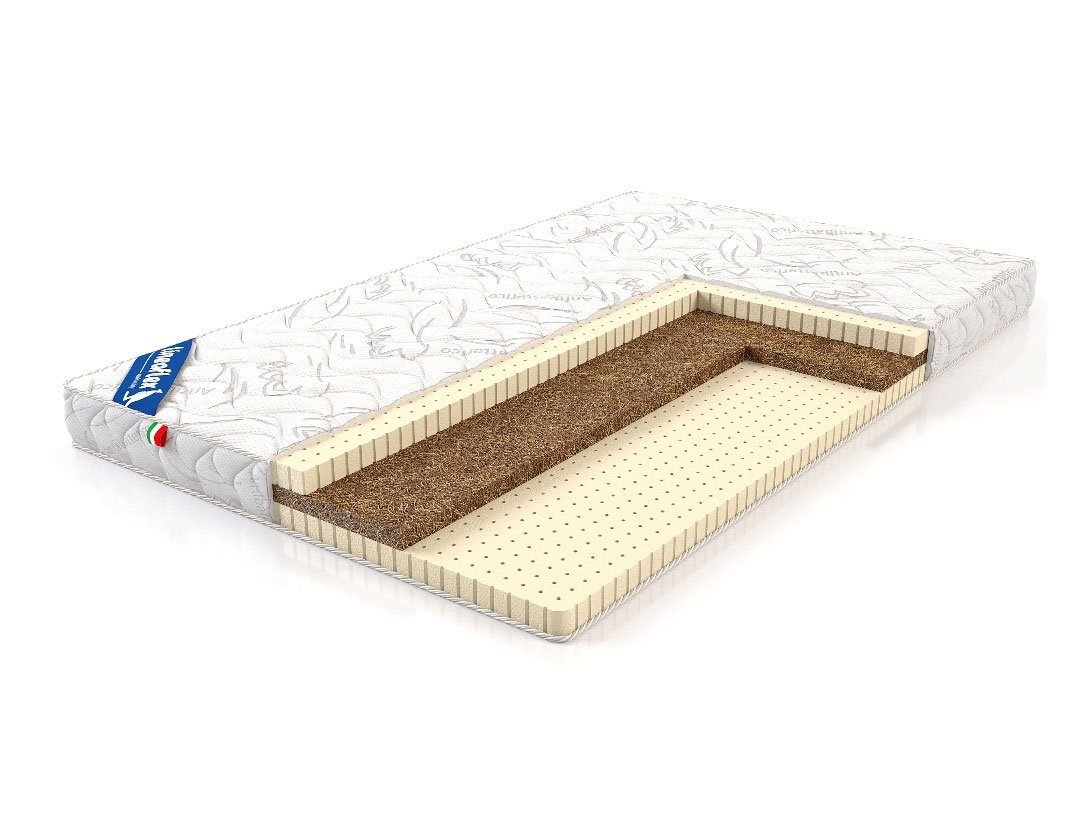 По своей структуре матрас напоминает сэндвич, который состоит из объёмных настилочных слоёв. В данном случае между полотнами натурального латекса устанавливается плита койры кокоса, которая как бы зажимается и служит сердцевиной изделия.