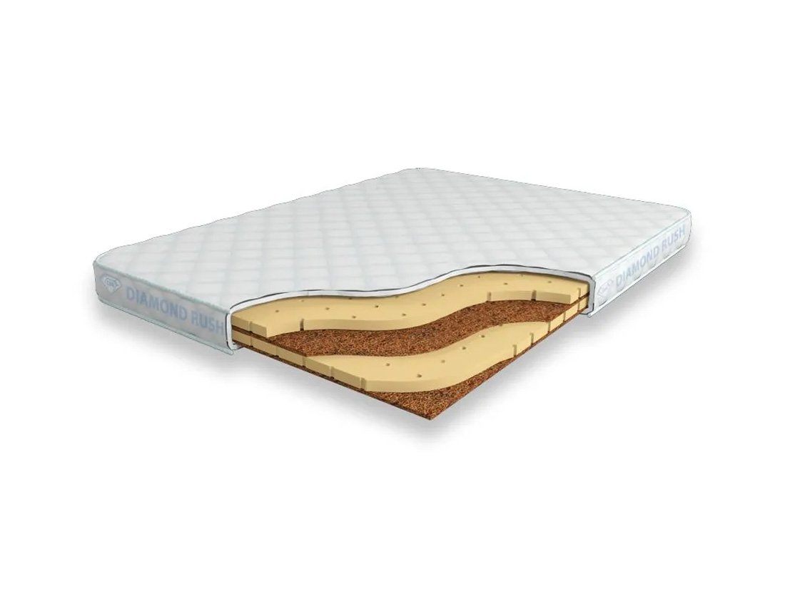 Матрас Diamond Rush Mix Cocos 8 DR является беспружинным, т.е. не имеет в своей основе пружинного блока. В его состав входят чередования слоев латексированной кокосовой койры (1см) и натурального латекса с перфорацией (3см). Эта модель имеет разные по жесткости стороны.