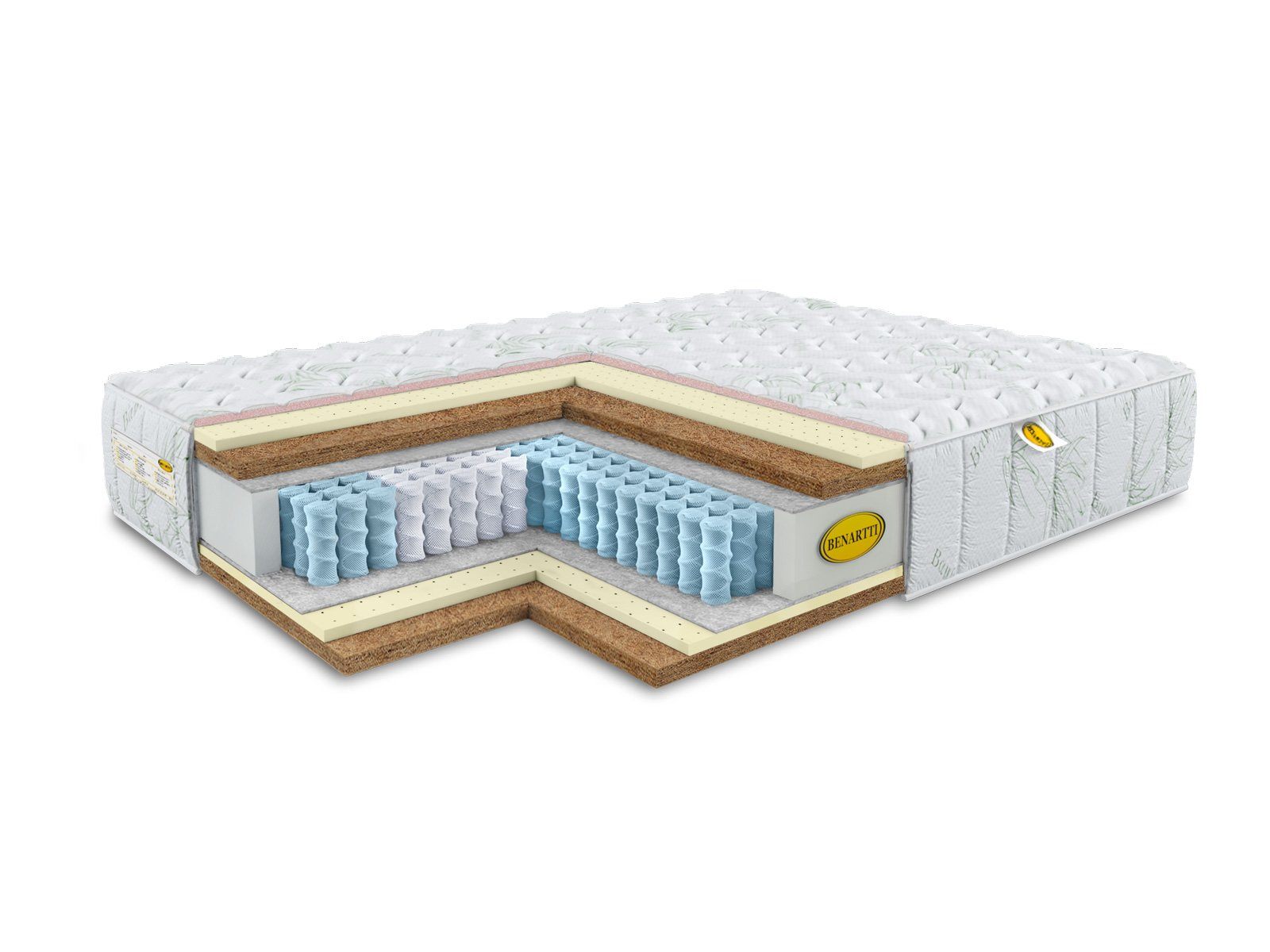 Также в состав матраса включены и специальные наполнители, которые не просто продолжают, но усиливают работу S1200. Слои кокоса и натурального латекса установлены с каждой из сторон, однако их пропорции отличаются. Благодаря этому матрас приобрёл высокий и средний уровни жёсткости. Их можно менять, просто перевернув изделие. Для этого по бокам модели предусмотрены удобные ручки. Натуральный латекс обеспечивает анатомичную и более мягкую поверхность матраса, а кокосовая койра даёт высокую жёсткость и выраженную поддержку для позвоночника.