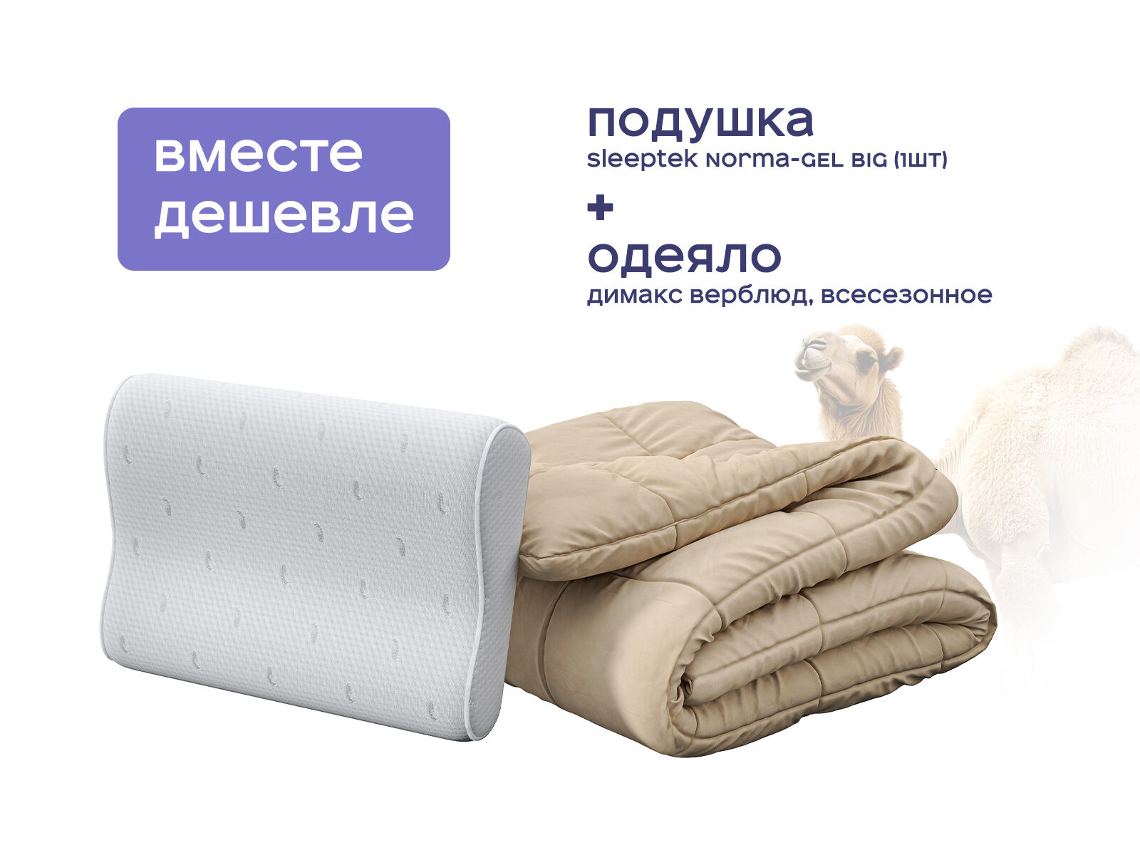 Комплект одеяло Димакс Верблюд всесезонное + подушка Sleeptek Norma-GEL BIG 1 шт. Получите выгоду до 38% за покупку готовым набором. Этот комплект создан для тех, кто хочет, чтобы сон стал не просто отдыхом, а зарядкой энергии: его сердце — одеяло из верблюжьей шерсти, которое регулирует температуру, и подушка Sleeptek Norma-GEL BIG, сочетающая ультра-поддержку мемори-пены и охлаждающий гель. Вместе они работают как система, которая бережёт ваше тело, снижает стресс и дарит ощущение обволакивающего комфорта.