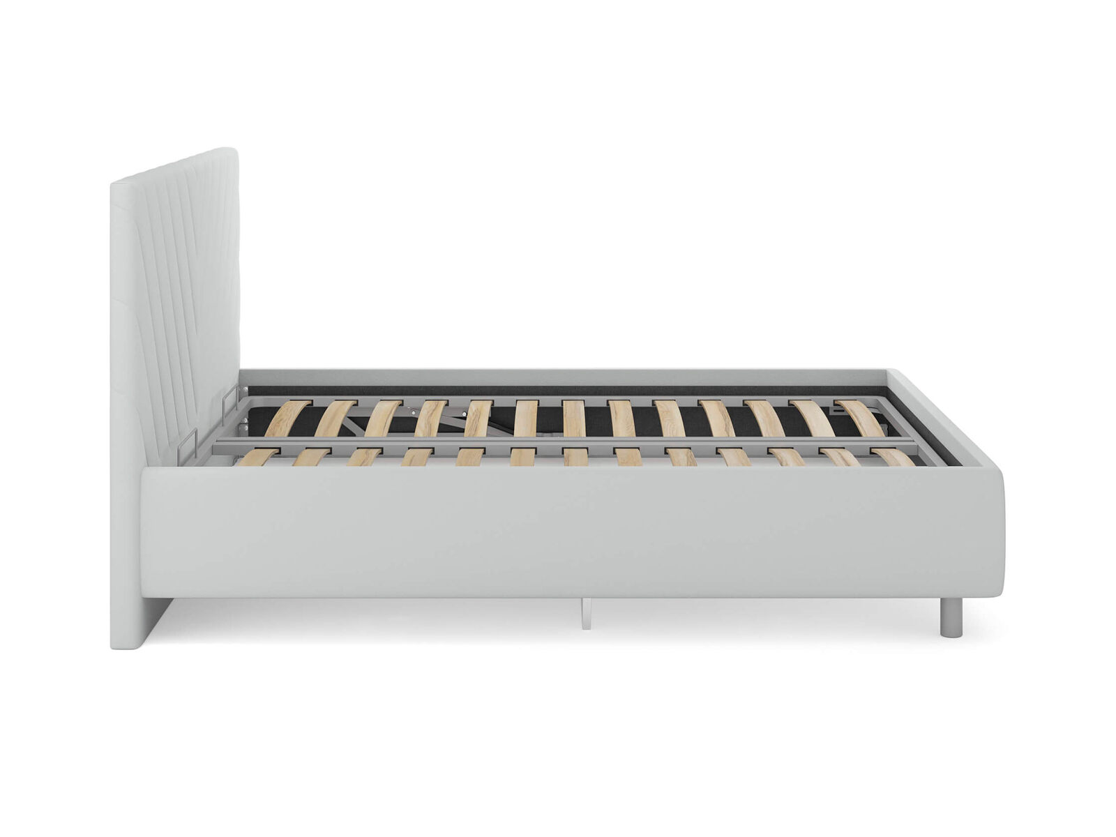Кровать комплектуется металлическим основанием (без опор), которое имеет 13 рядов встроенных березовых ламелий на каждое спальное место, обеспечивая равномерное распределение нагрузки.